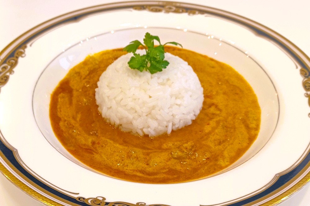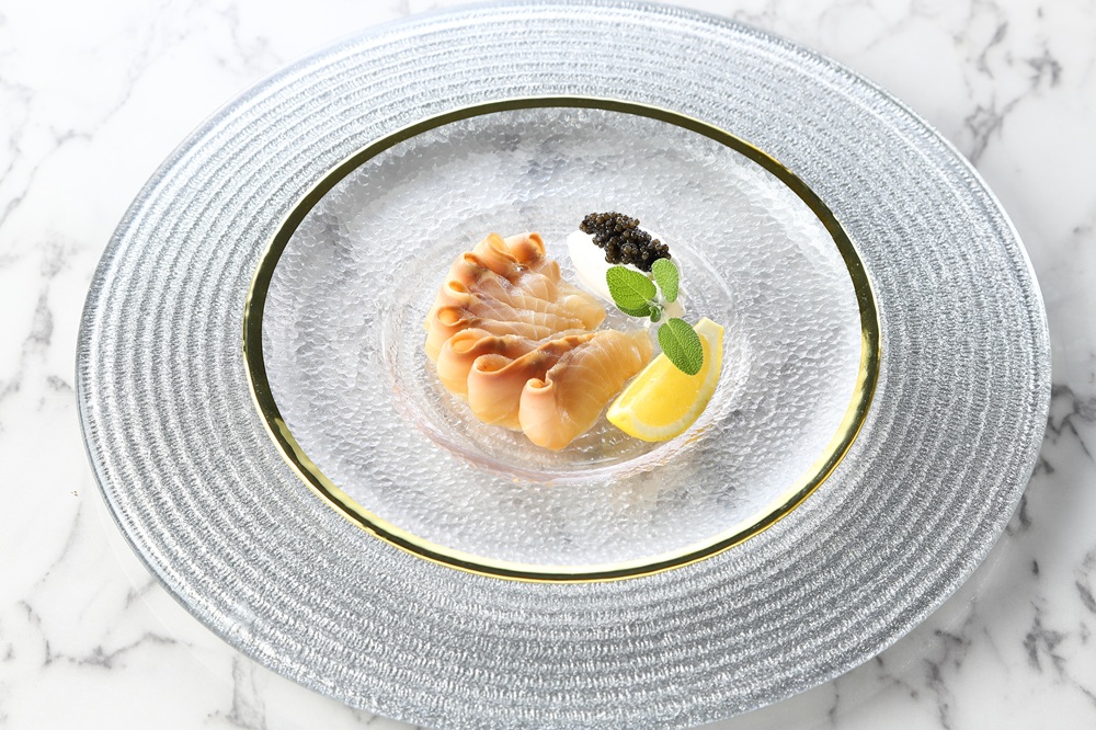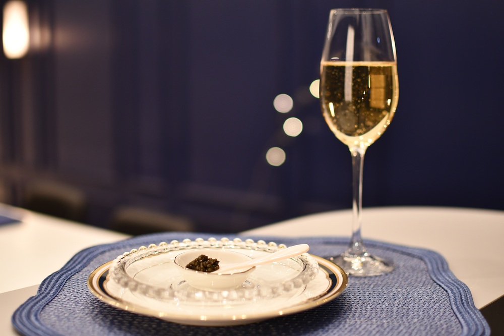 Menu チョウザメカレー、スプーンキャビアとチョウザメスモーク、スパークリングワイン